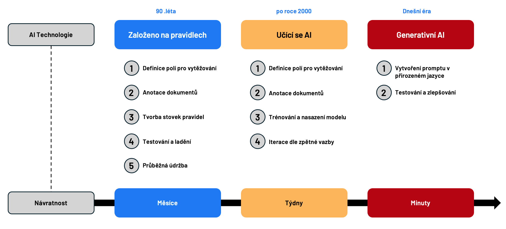 Dříve bylo vytěžování nejtěžší částí dokumentové automatizace. Nastavení vytěžovacích nástrojů bylo rigidní, založené na pravidlech, šablonách a jejich nastavení a ladění trvalo často měsíce.